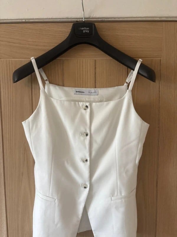 See all outfit ideasThis off-white square neck waistcoat from Bershka features a crisp, clean look with a button-front closure and functional pockets. Ideal for a polished, smart-casual ensemble.