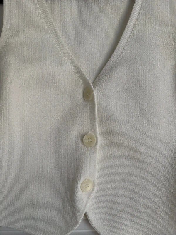 A classic Bershka waistcoat in white/cream hues, crafted from a soft, ribbed fabric. Features three pearlescent buttons down the front, perfect for a polished look.