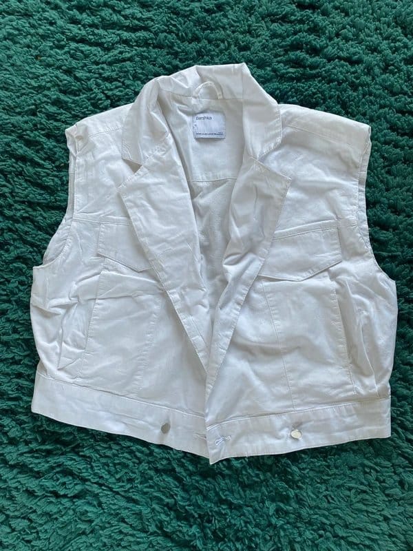 Stylish white denim waistcoat from Bershka. Crafted from lightweight denim, it features a classic silhouette with functional pockets and a button-front closure. Perfect for layering over casual outfits.