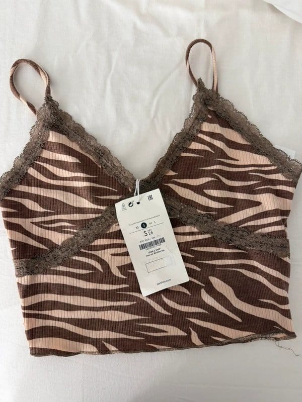Trendy Bershka zebra cami in brown and beige with a lace trim and adjustable straps. Perfect for a casual yet stylish look.