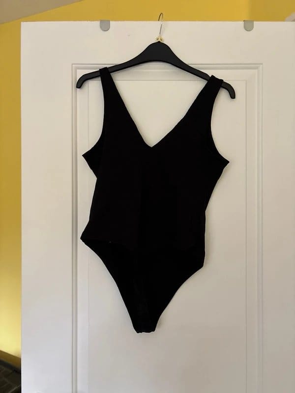 The Bershka Black Ribbed Thong Bodysuit is ideal for casual, evening, date-night.