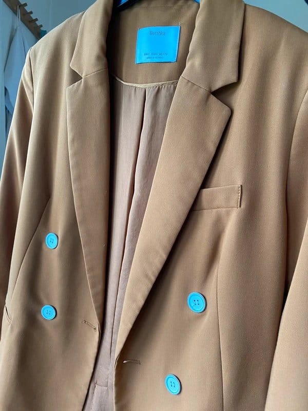 Stylish Bershka blazer in a mix of mustard and brown hues. Featuring a double-breasted front, blue buttons, and a classic tailored fit. Perfect for both casual and formal occasions.