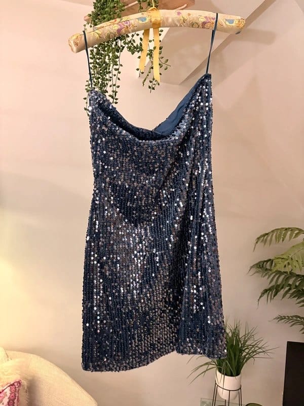 The Bershka Blue Sequin Bandeau Strapless Mini Dress is available in sizes M.
