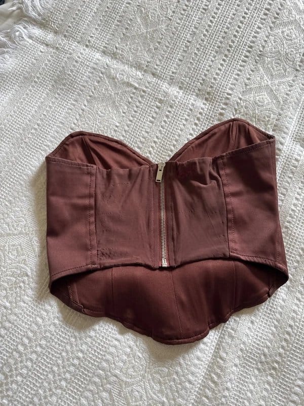 Stylish brown silky corset top with a mesh zip-up back for a modern twist on classic corsetry. Perfect for adding a touch of edge to your wardrobe.