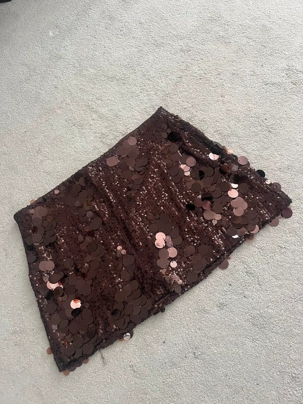 This chocolate sequin skort from Bershka features a sparkly fabric with a mini skirt silhouette. Ideal for adding a touch of glamour to your casual outfits.