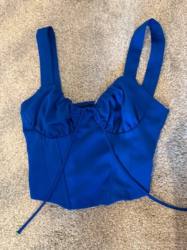 The Bershka Blue Berska Corset Tie Top is available in sizes S.