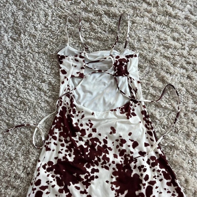 This Bershka dress features a cow print design in cream and brown. It has a corset feature at the back and is double lined for added comfort. Perfect for casual outings.