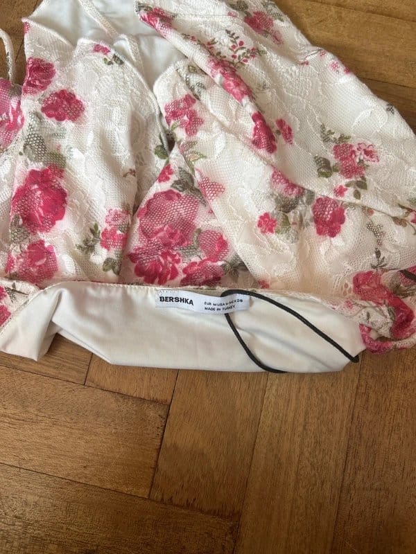 Delicate cream lace camisole with pink floral embroidery from Bershka. Features stretchy material for a comfortable fit. Ideal for layering or casual wear.