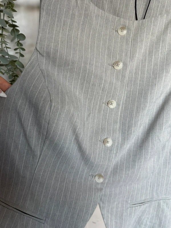 See all outfit ideasStylish Bershka grey striped waistcoat with a classic pinstripe pattern. Made from a soft cotton blend, it features a button-front closure and two front pockets. Perfect for layering over casual outfits.