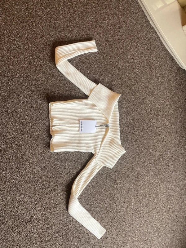 This cream off-the-shoulder cropped jumper by Bershka is made from a super soft and stretchy material, perfect for comfort. It features a zip-up front and a cropped hem for a stylish look.