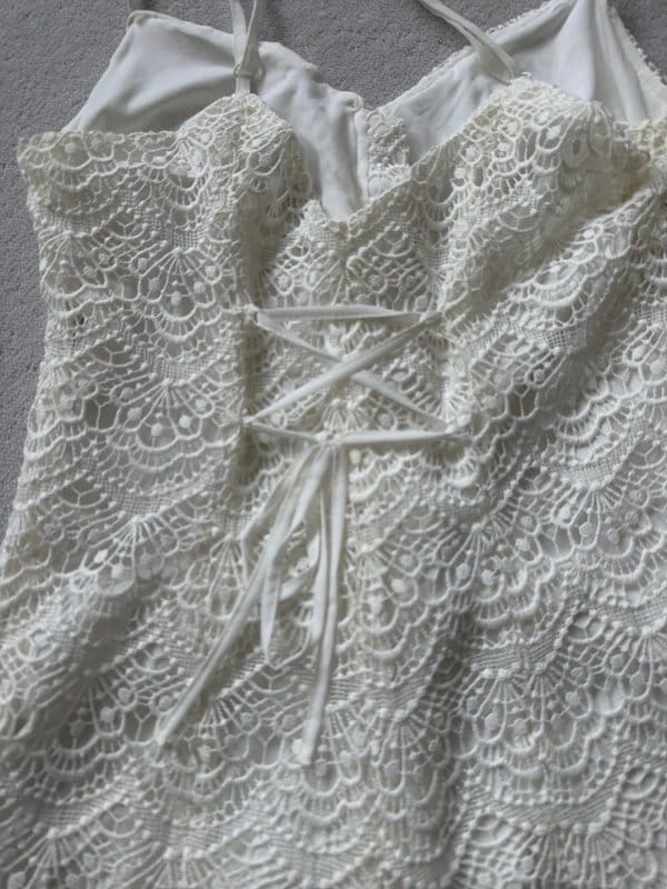 Delicate lace playsuit in cream from Bershka. Features adjustable straps and a tie-back for a customizable fit. Ideal for casual outings or special occasions.
