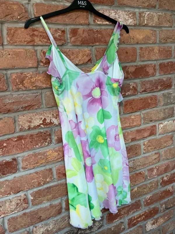 This Bershka floral print chiffon dress is fully lined and made from 90% polyester and 10% elastane. It features a beautiful and light fabric, making it perfect for warm days. The dress measures 59cm in length from the neckline and is in immaculate condition.
