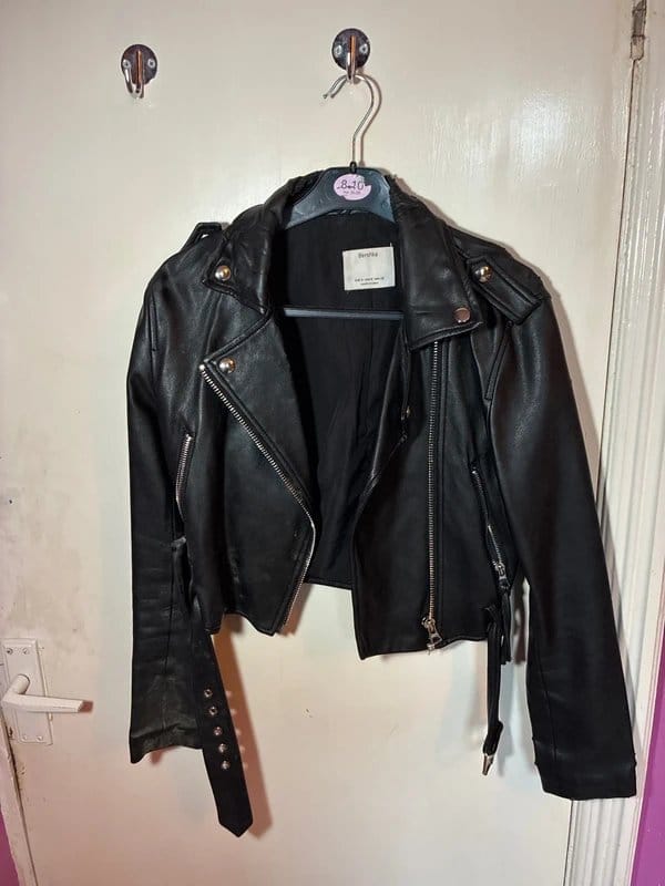 A stylish black leather cropped jacket from Bershka. Features a zip front, zip pockets, and riveted details for a rugged look. Perfect for adding an edgy touch to any outfit.
