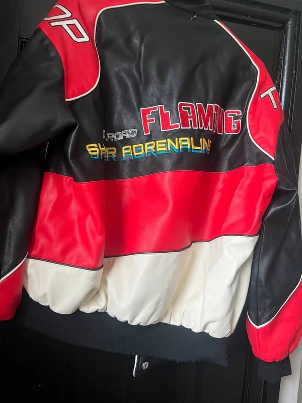 Bold red leather racer style jacket by Bershka. Features a striking red and black colour block design with white accents and graphic text. An oversized fit suitable for sizes XS to M.