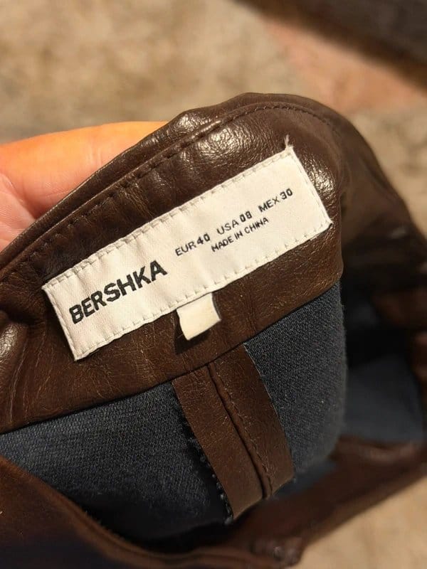 Stylish Bershka brown leather skort with a denim-like lower part. Features a leather-like upper and a denim skirt for a unique look. Perfect for casual outings.