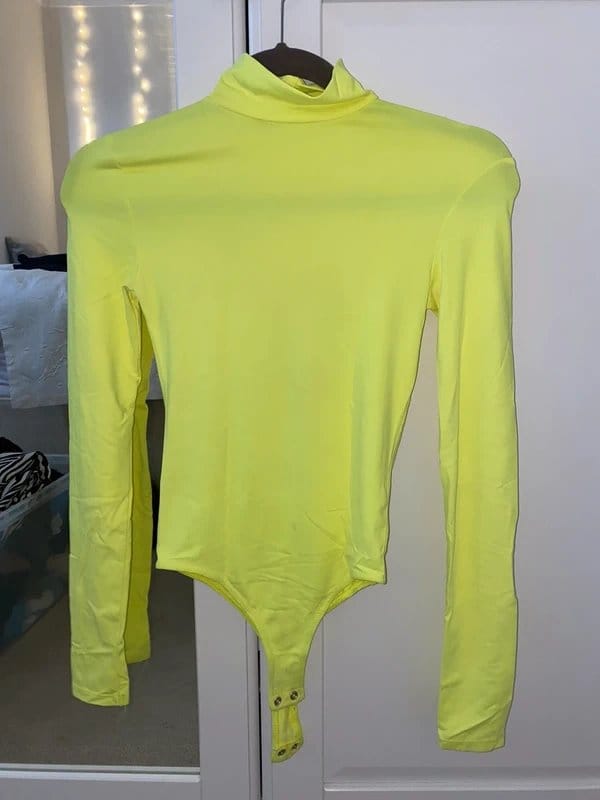 This neon yellow/green bodysuit from Bershka is a statement piece with its slinky, soft material. It features a high neck and long sleeves, making it a flattering choice for any occasion.