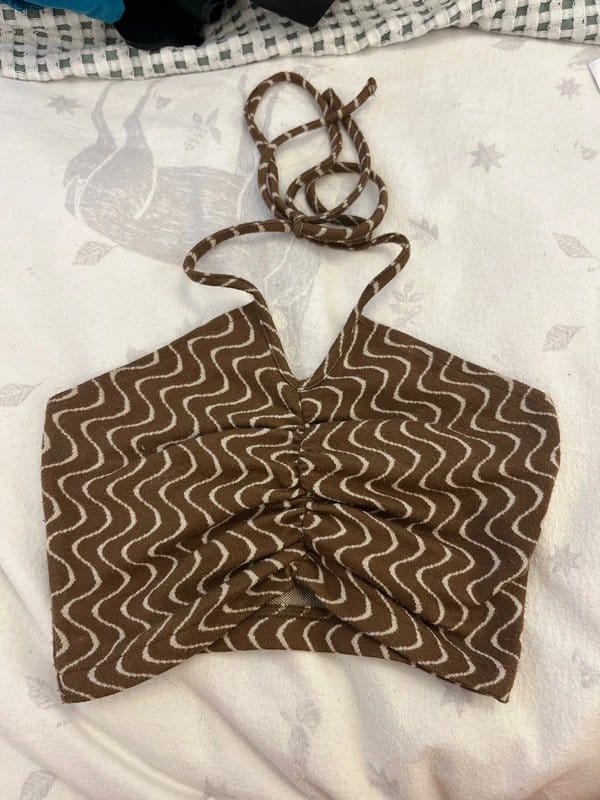 This Bershka crop top features a brown and white swirly pattern with an embellished design. Perfect for a preppy streetwear look.