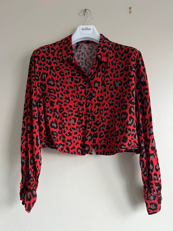 The Bershka Leopard Print Crop Shirt in Red is available in sizes M.