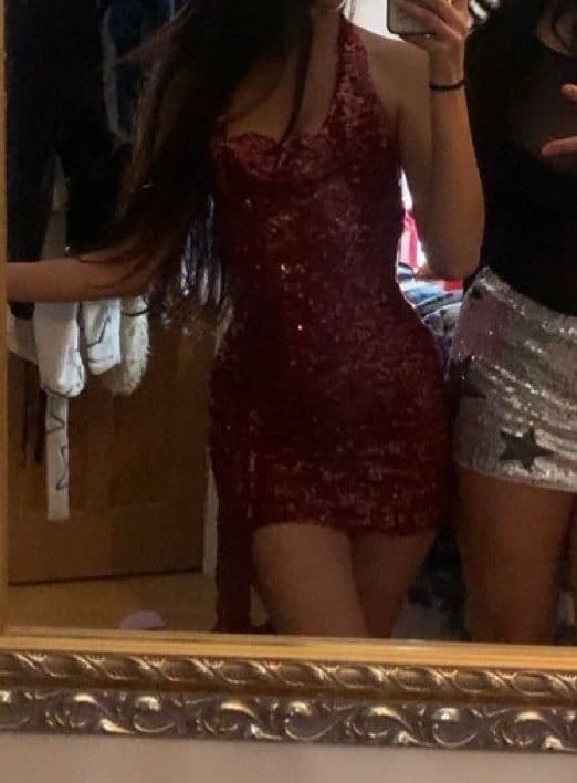 “Pair with red strappy heels and a clutch bag for a glamorous evening look.”