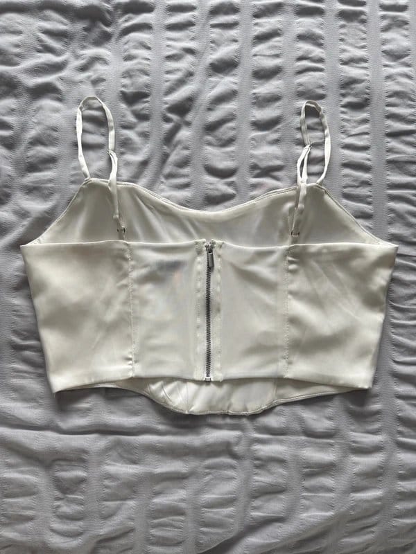 Sleek white silk corset top from Bershka with adjustable straps and a zipper closure. Designed for a fitted silhouette that accentuates the waist.