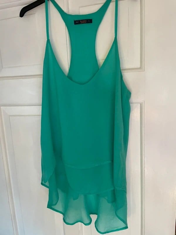 Stylish sleeveless green chiffon top from Bershka. The fine fabric offers a delicate feel and a flattering fit for sizes 12-14.