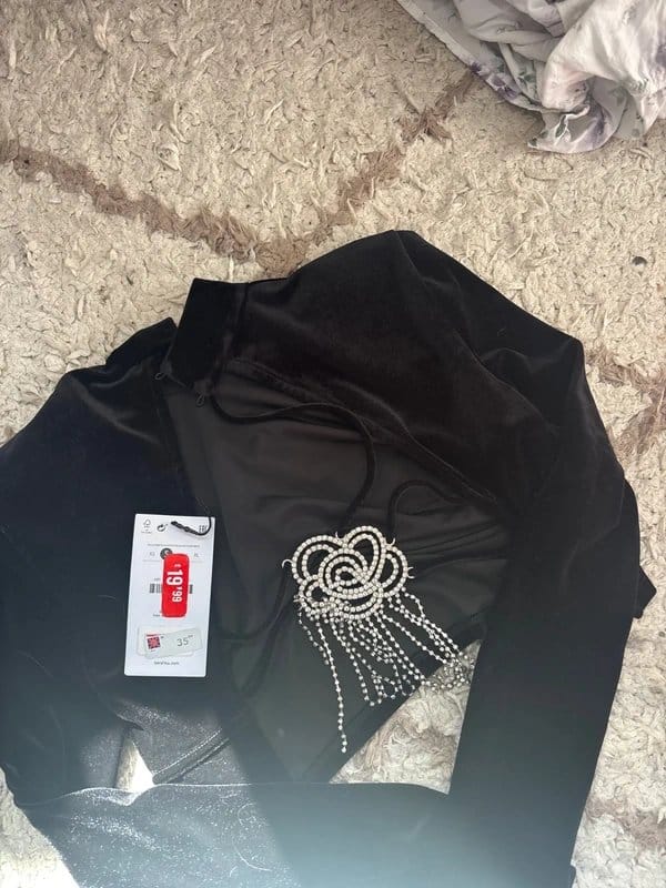 Elegant black velvet tight top by Bershka featuring a high round neckline and long fitted sleeves. The top includes a decorative beaded embellishment on the front, adding a touch of glamour.