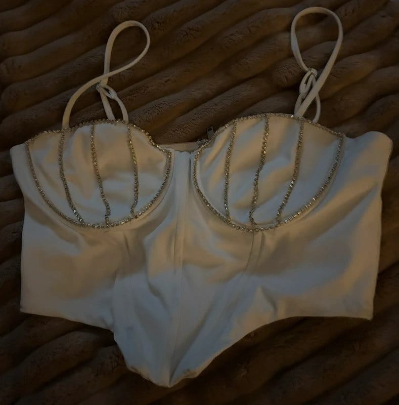 The Bershka Cream Embellished Satin Bustier Corset - Size S is made from satin, rhinestones.