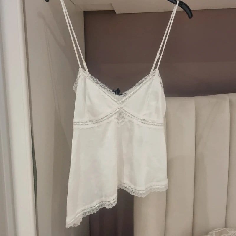 This white satin cami top from Bershka features a gorgeous lace pattern and a zip closure at the side. The delicate lace trim adds a touch of elegance, making it perfect for a casual or intimate occasion.