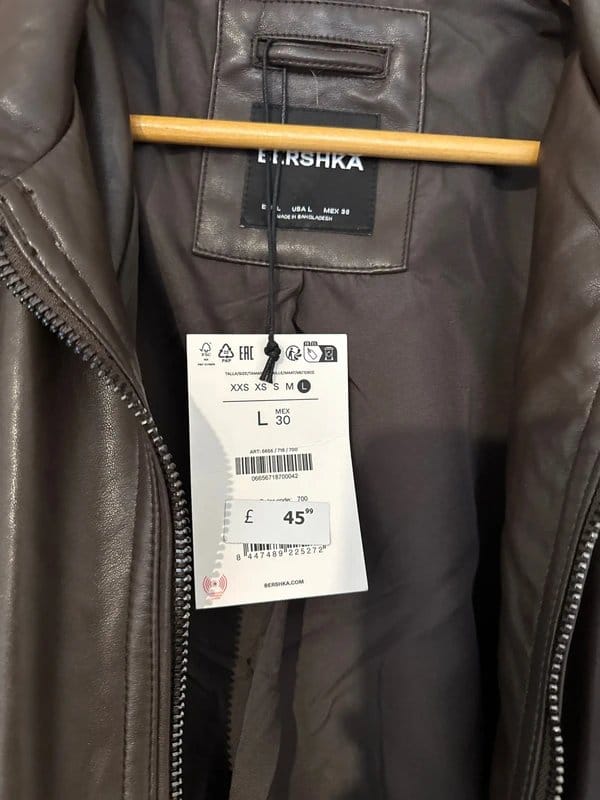 Stylish Bershka brown leather jacket with a sleek, structured silhouette. Features a full-length zipper, two side pockets, and a zippered inner pocket. Perfect for adding an edgy touch to any outfit.