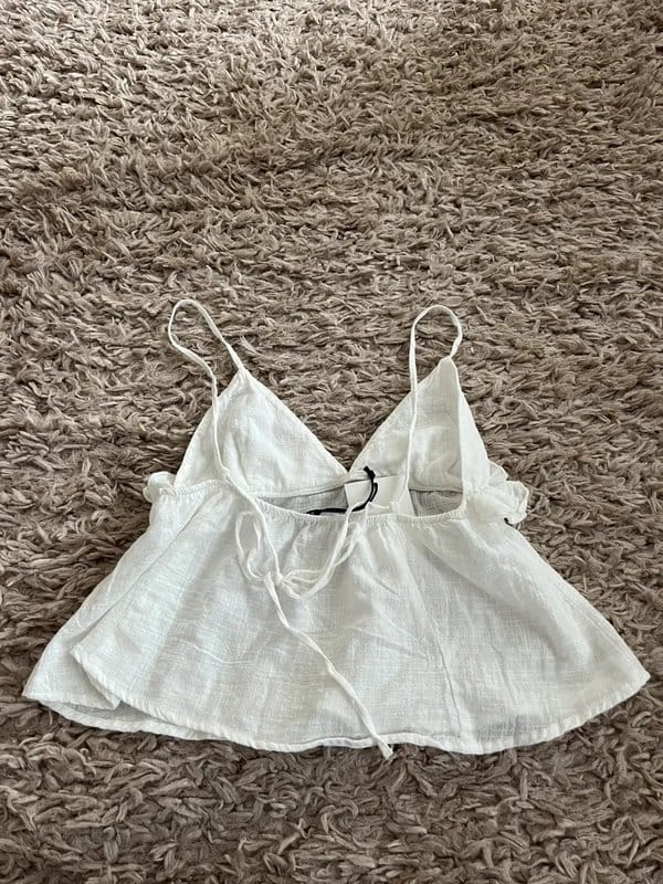This Bershka white cami top is perfect for summer. The double-layered top features a floaty, slightly see-through material. It has adjustable shoulder straps that tie at the back and an elasticated back for comfort. New with tags, size M fits approximately size 8/10.