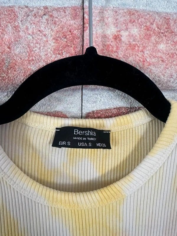 The Bershka Yellow Cotton Tie Dye Ribbed Dress is available in sizes S.