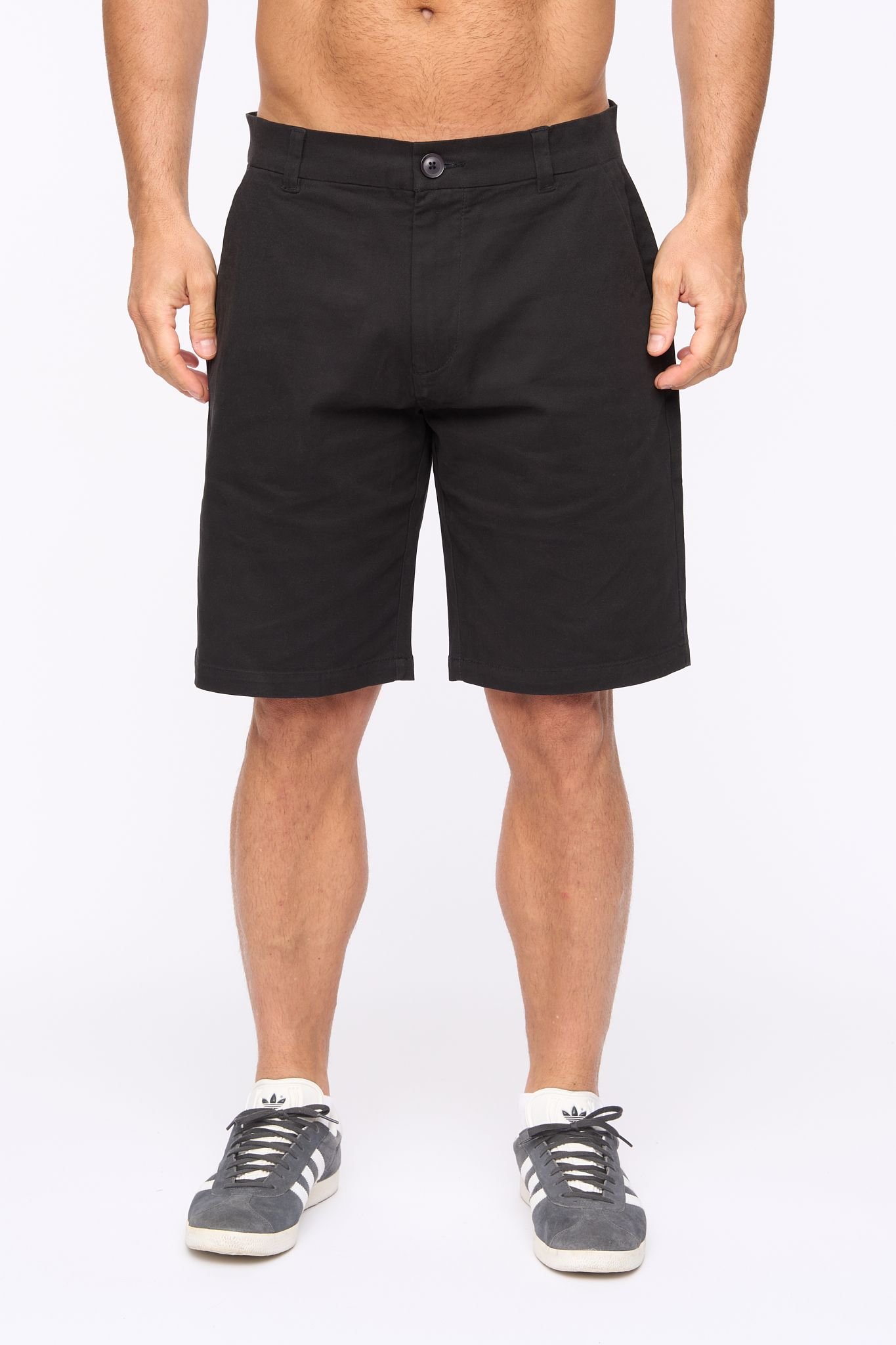 Master the art of understated summer style with these black cotton stretch chino shorts. Featuring a clean, above-knee cut and classic chino aesthetic, these shorts are perfect for transitioning from a relaxed afternoon to a smart evening.