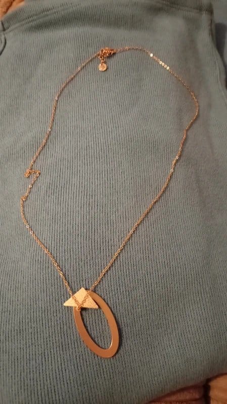 Stylish gold tone necklace from Big Metal London featuring a unique oval pendant with a triangle design. Perfect for adding a touch of elegance to any outfit.