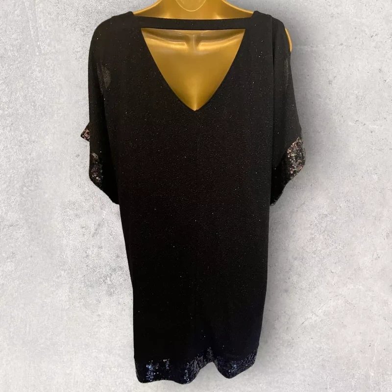 The Billie & Blossom Black Sequin Cold Shoulder Shift Dress is available in sizes S.