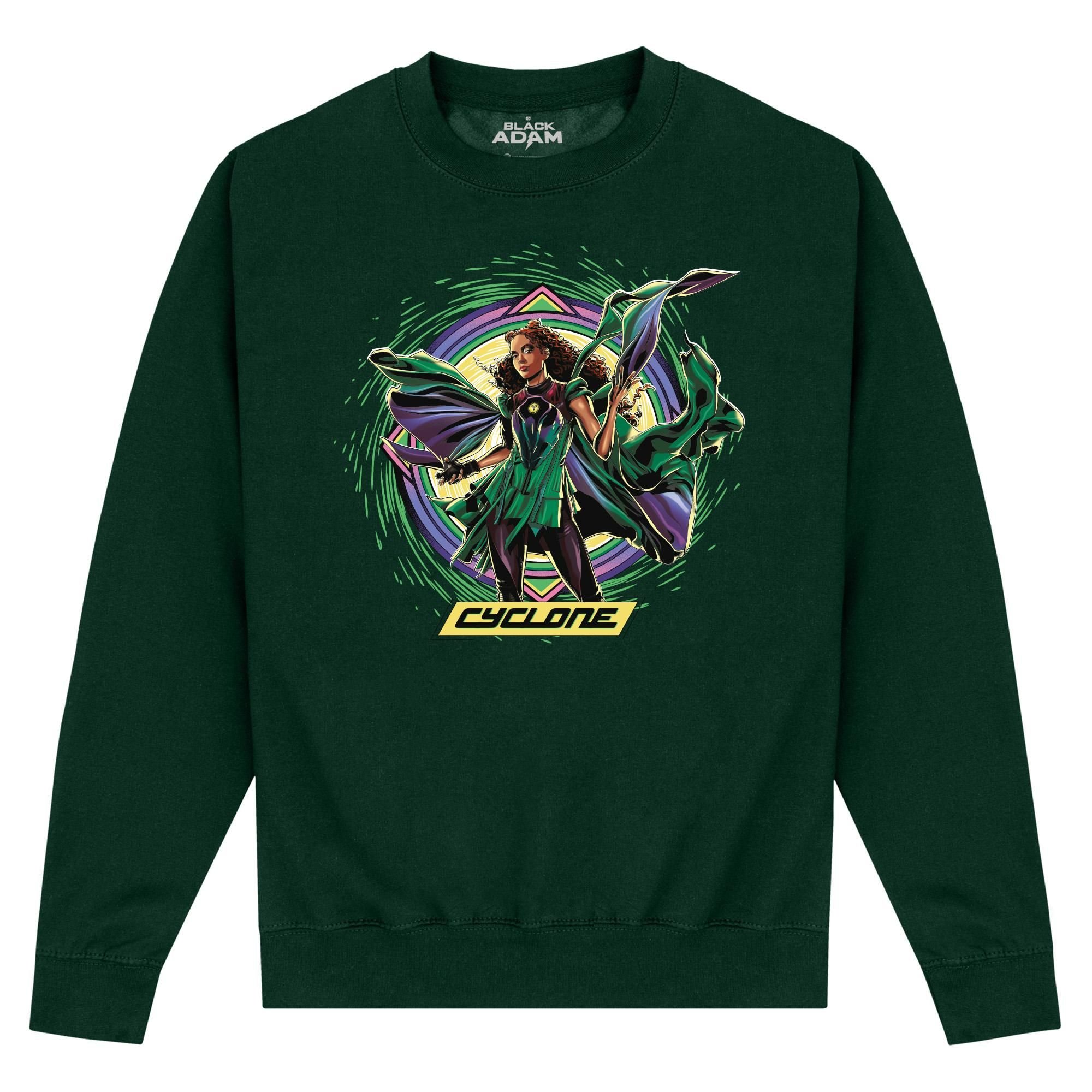 This Bottle Green Black Adam sweatshirt features a printed graphic of the character Cyclone. Made from a soft cotton/polyester blend, it offers a loose fit and ribbed crew neckline and cuffs. Ideal for casual wear or as a statement piece.