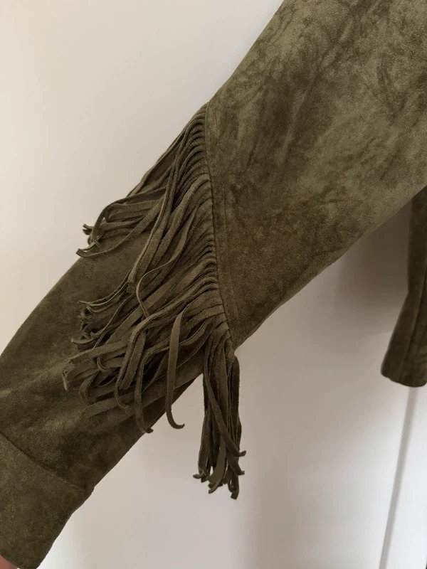 This Blank NYC Khaki Green faux suede shirt jacket with fringe detailing along the back, arm, and sleeve is perfect for adding a touch of quiet luxury to your wardrobe. The jacket features a comfortable fit, suitable for UK size 16 - 18.