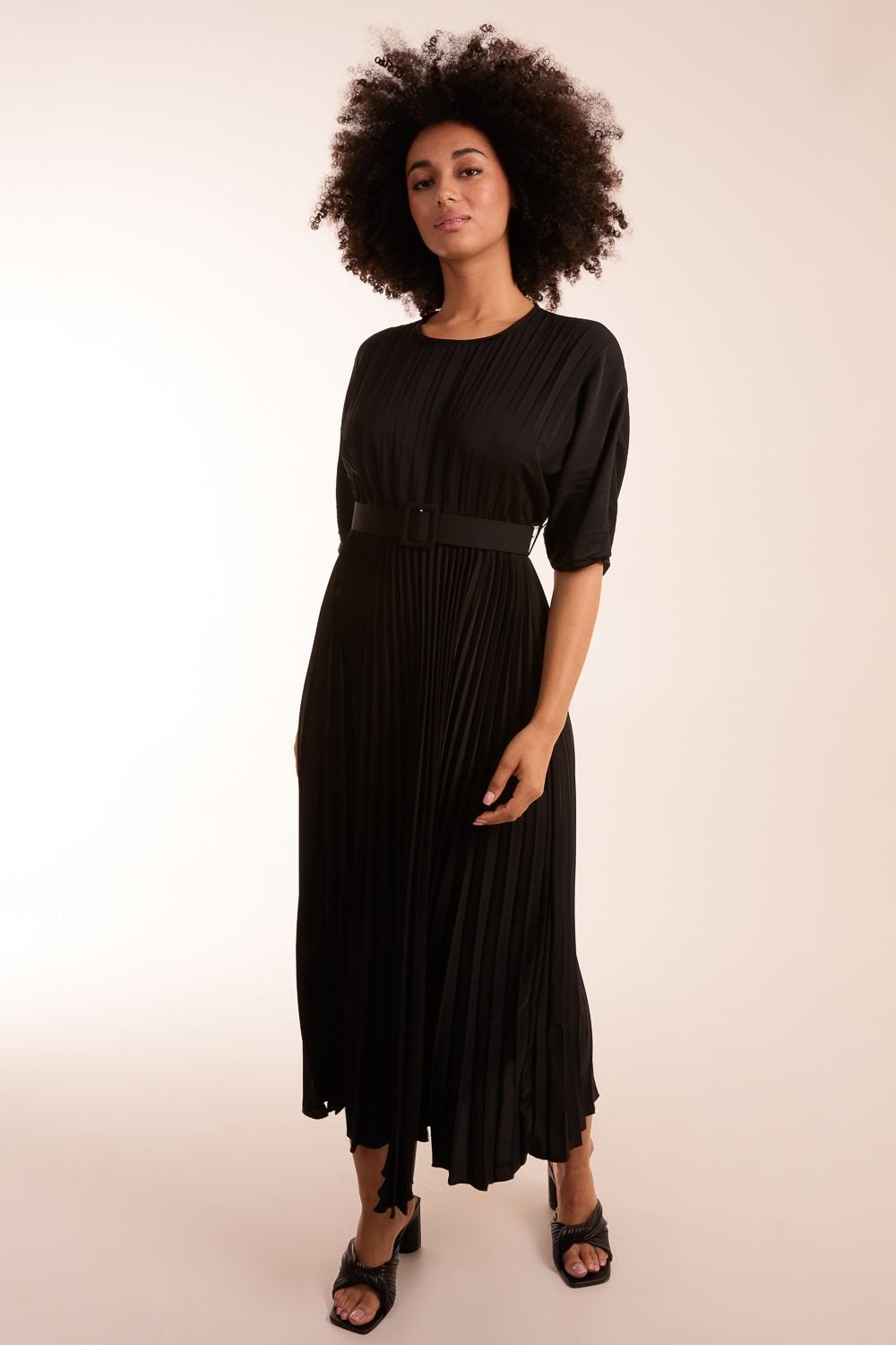 Stylish black pleated dress with a belt for a defined waist. Perfect for any formal occasion with its elegant and sophisticated look.