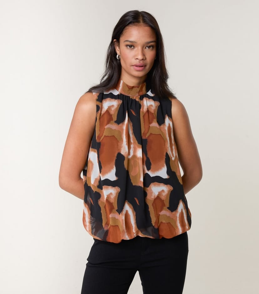 Trendy high-neck sleeveless top in a black abstract print by Blue Vanilla. Features a bubble hem and a rear keyhole button fastening. Ideal for casual or smart-casual looks.