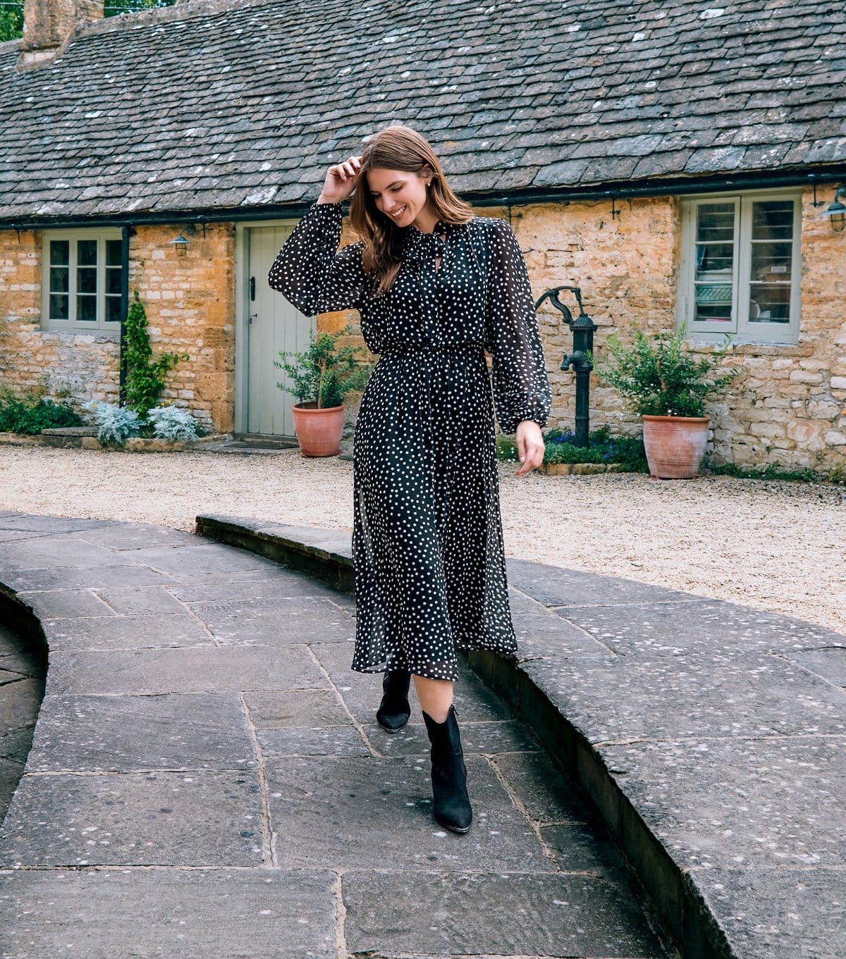 This black polka dot midi dress offers playful elegance with its figure-skimming fit and sheer sleeves. Perfect for any day-to-night look, it flows neatly from the elasticated waist.