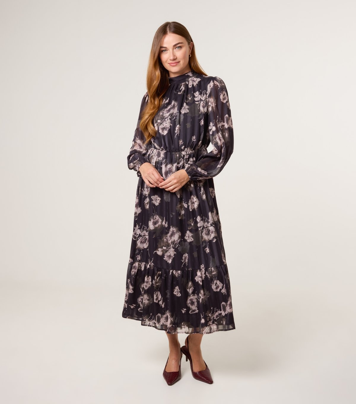 This floral midi dress from Blue Vanilla features long flowy sleeves and an elegant high neck. The chiffon fabric sparkles with fine metallic threads, perfect for special occasions.