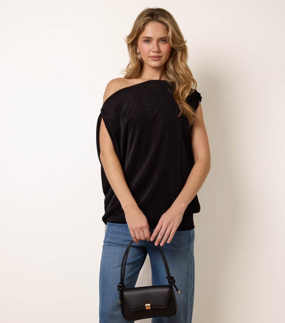 This black jersey tunic top by Blue Vanilla features an off-shoulder neckline and an oversized fit. Ideal for casual weekends or an easy evening look, it offers effortless style.