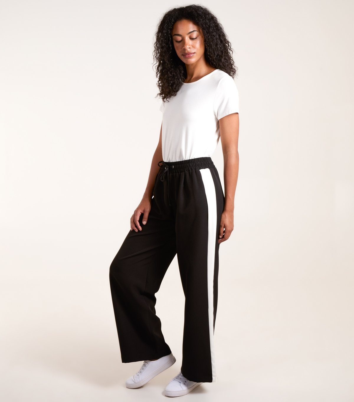 Stylish full-length trousers in a relaxed fit from Blue Vanilla. Featuring a drawstring waist and wide-leg silhouette, these trousers have a black and white side stripe design. Ideal for casual wear.