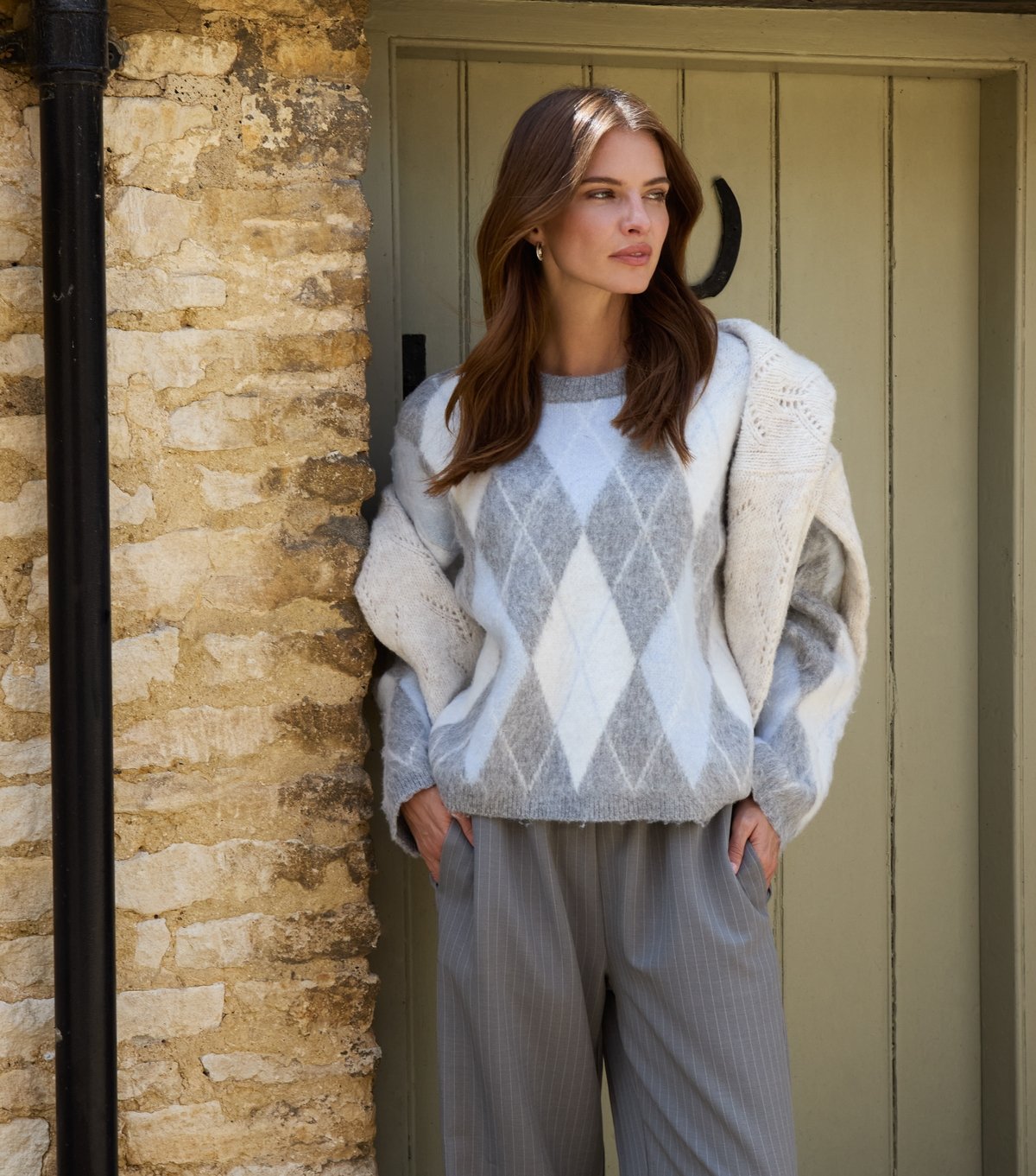 This Blue Vanilla jumper features a soft blue argyle knit pattern, offering a preppy edge to your wardrobe. Ideal for layering, it's perfect for casual outings or relaxed days at home.