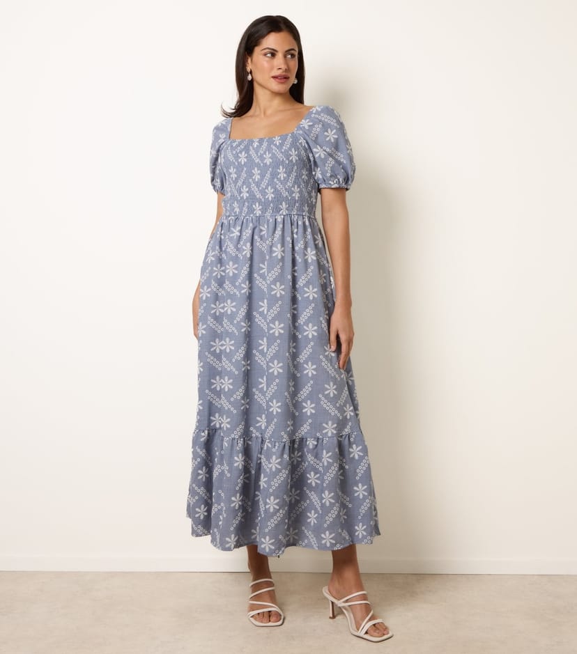 Charming blue floral embroidered midi dress from Blue Vanilla. Featuring a shirred elasticated bust and a flared skirt, this dress is perfect for casual outings.