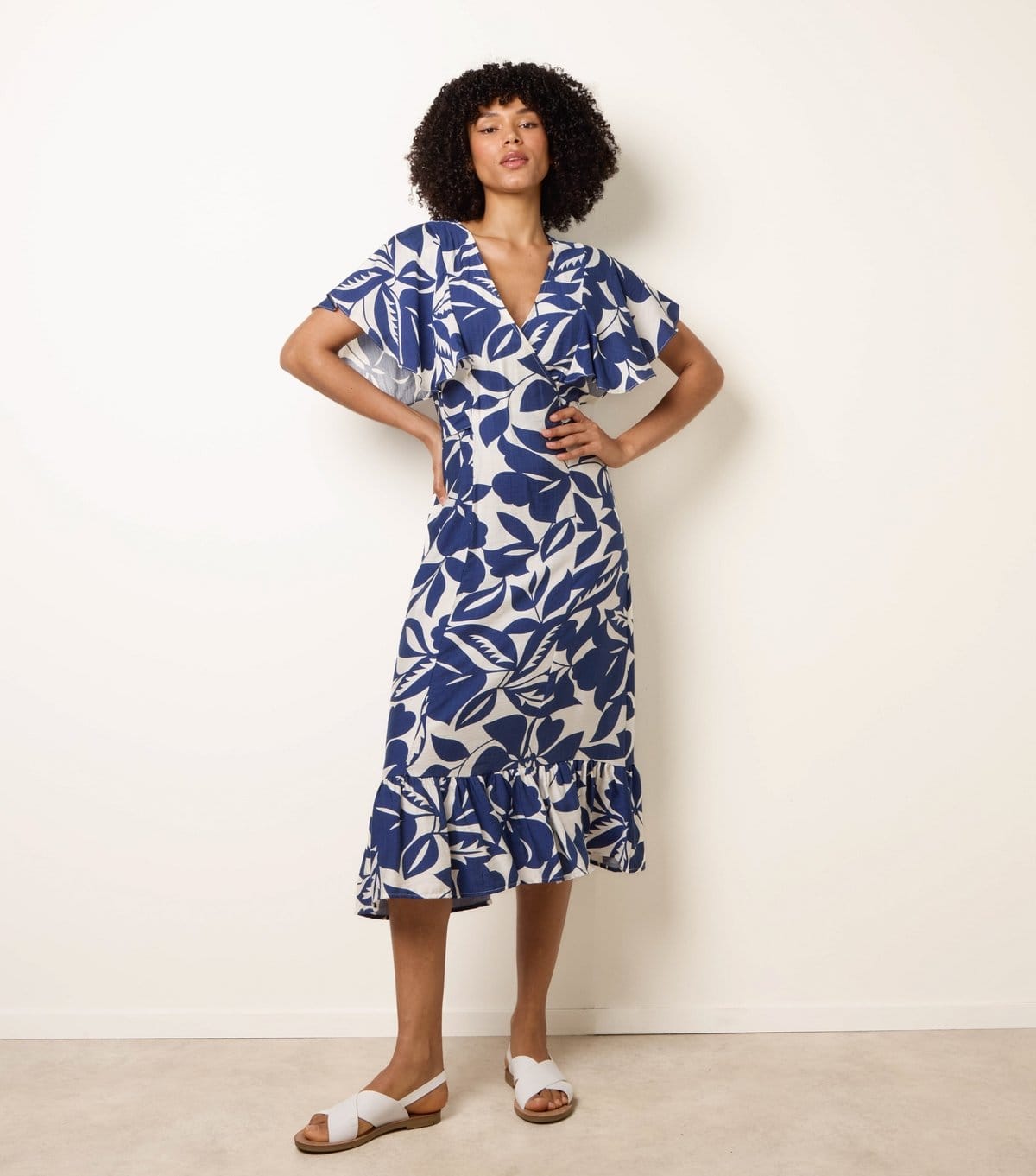 This blue floral wrap midi dress features fluttery sleeves and a ruffled hem for extra flair. The classic wrap front provides a flattering fit. Ideal for casual and evening occasions.