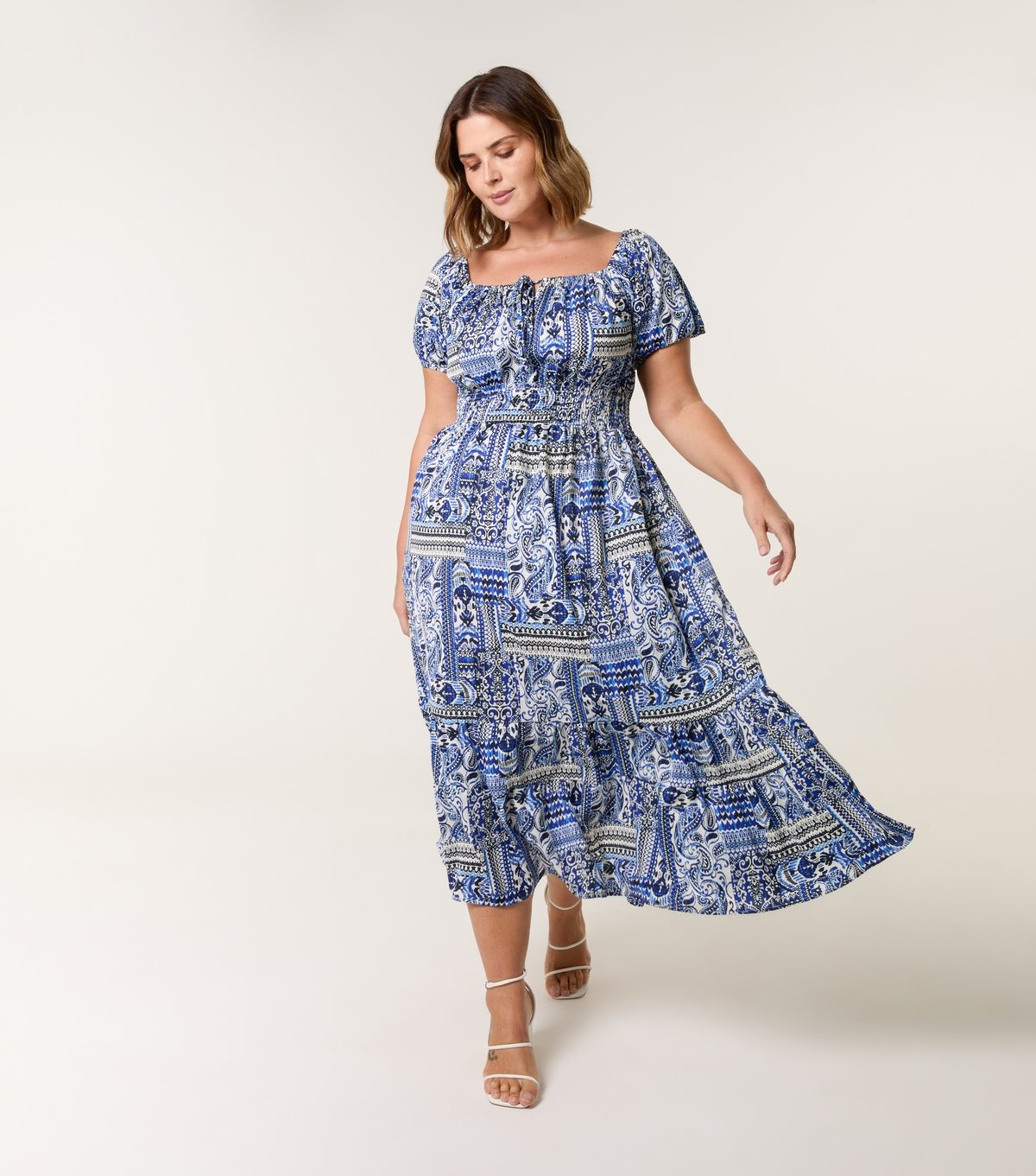 The Blue Vanilla Curve Blue Paisley Midi Dress is available in sizes 18, 22.