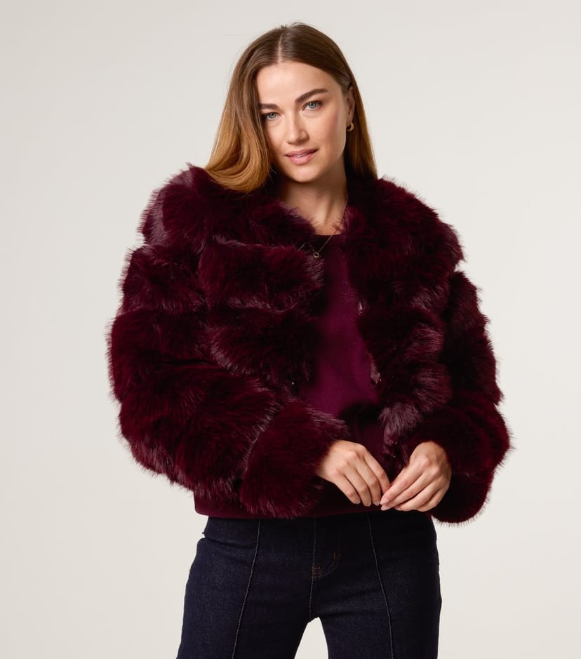 The Blue Vanilla Dark Burgundy Boxy Faux Fur Jacket is made from faux fur.
