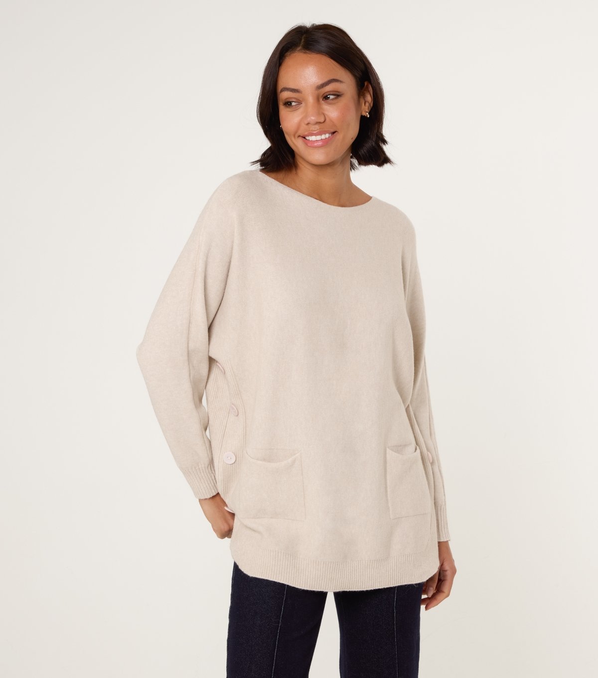 This cream oversized jumper by Blue Vanilla features a slash neck and patch pockets. Made from a soft knit fabric, it offers a loose fit for comfort and easy layering.