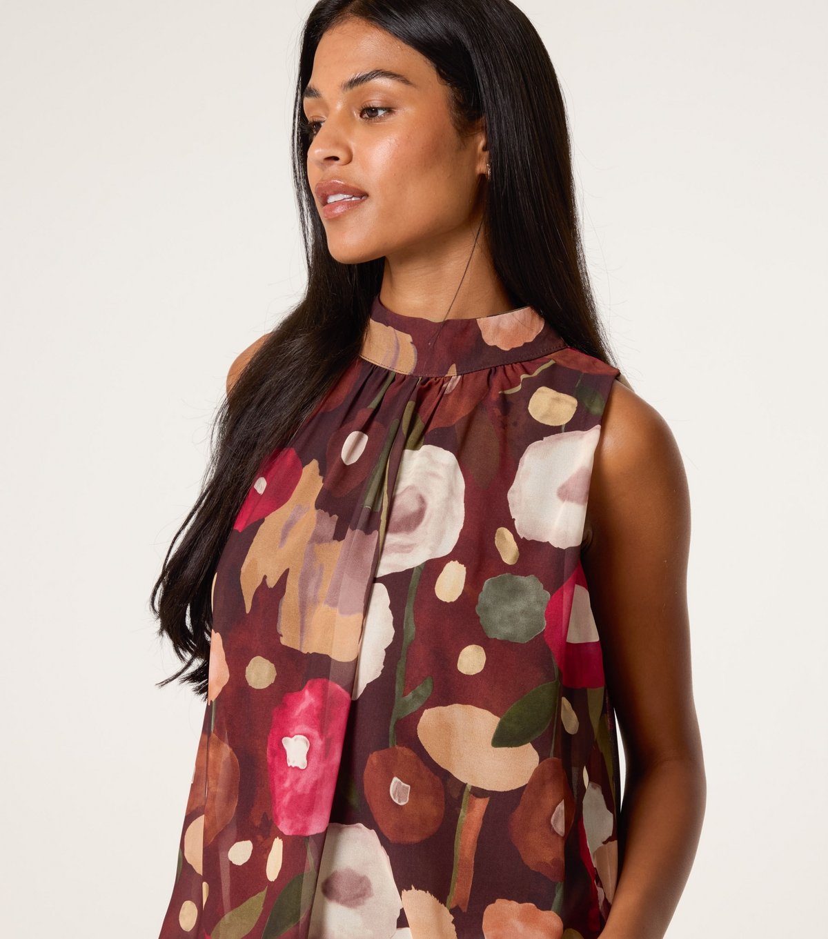 This Blue Vanilla top features a relaxed fit and a high neck with a sleeveless design. The brown floral print adds a touch of summertime flair, perfect for casual outings.