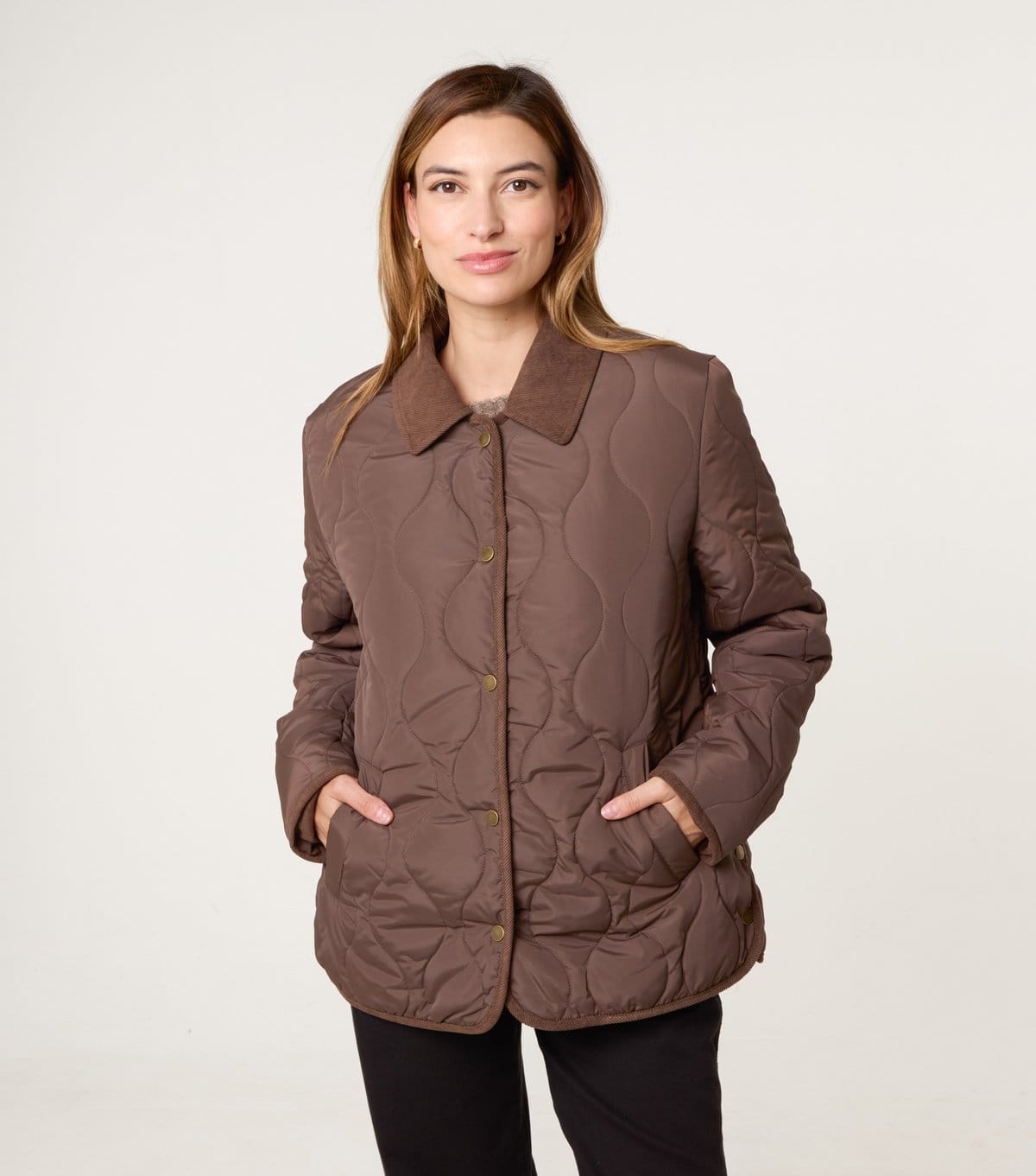 This brown quilted corduroy collar coat offers warmth and style with its chic button-down design. Perfect for a weekend stroll or adding a cosy touch to your everyday outfit.